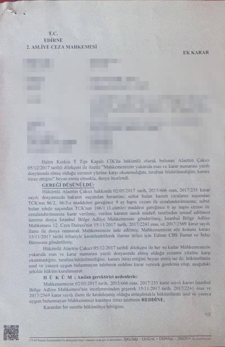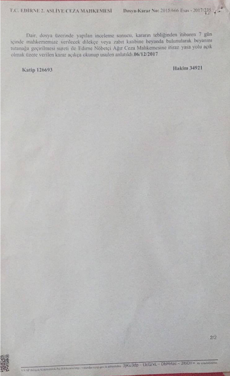 NOT: İki sayfalık Edirne Asliye Ceza Mahkemesi’nin kararını ekte sunmaktayım.