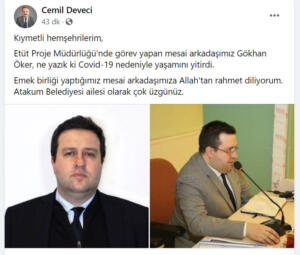 Atakum Belediye Başkanı Av. Cemil Deveci sosyal medya hesabından yaptığı paylaşımla Etüt Proje Müdürlüğü’nde görev yapan Gökhan Öker’i koronavirüs nedeniyle kaybetmenin üzüntüsünü yaşadıklarını söyledi.