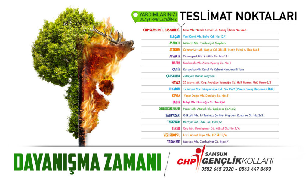 Son günlerde Türkiye’nin çeşitli yerlerinde meydana gelen yangınlardan dolayı CHP Samsun İl Gençlik Örgütü, yangın bölgelerinde bulunan ve zarar gören yurttaşların yaralarını sarmak ve yangına müdahale eden ekiplerin ihtiyaçlarını karşılamak için ‘Dayanışma Zamanı!’ kampanyası başlattı.