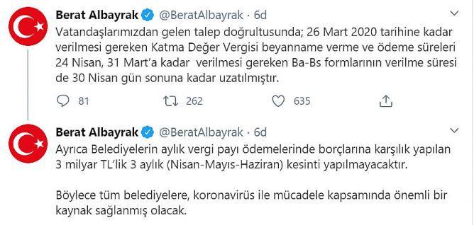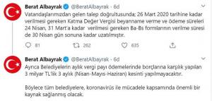 Hazine ve Maliye Bakanı Berat Albayrak koronavirüs tehdidine karşılık yeni tedbirler alındığını açıkladı. Bakan Albayrak, KDV beyannamesi verme ve ödemelerinin 1 ay ertelendiğini açıklarken, Belediyelerin aylık vergi payı ödemelerinde borçlarına karşılık yapılan 3 milyar TL’lik 3 aylık kesintinin yapılmayacağını kaydetti.