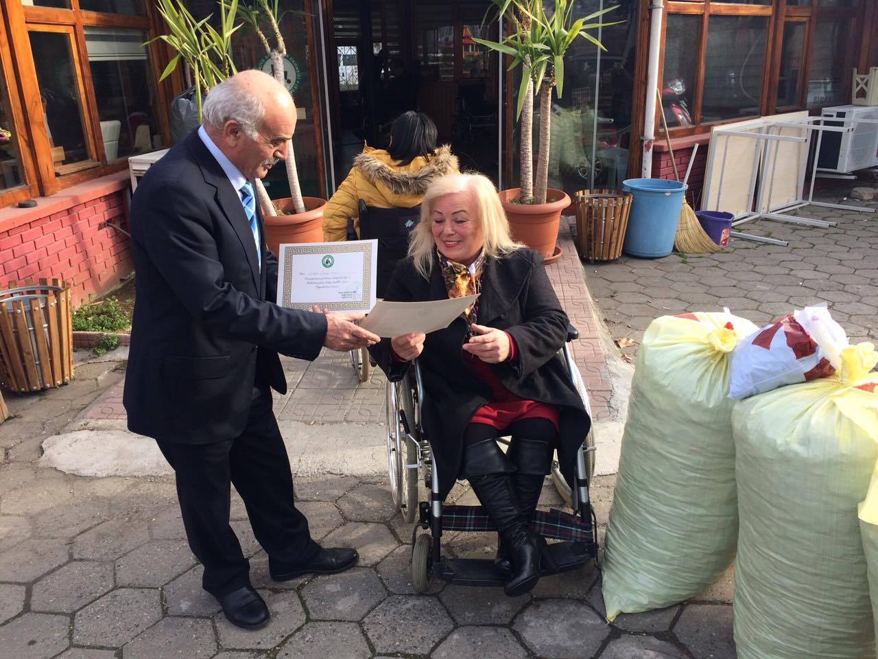 Dikbıyık Anadolu Lisesi’nin toplamış olduğu mavi kapakları Okul Müdürü Oktay Yılmaz Türkiye Sakatlar Derneği Samsun Şubesi Başkanı Hayriye Hakyemezoğlu ile görüşerek yine Samsun’daki merkezine getirerek teslim etti.