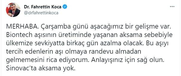 Sosyal medya hesabından açıklama yapan Bakan Koca, ”MERHABA. Çarşamba günü aşacağımız bir gelişme var. Biontech aşısının üretiminde yaşanan aksama sebebiyle ülkemize sevkiyatta birkaç gün azalma olacak. Bu aşıyı tercih edenlerin aşı olmaya randevu almadan gelmemesini rica ediyorum. Anlayışınız için sağ olun. Sinovac’ta aksama yok.” ifadelerine yer verdi.