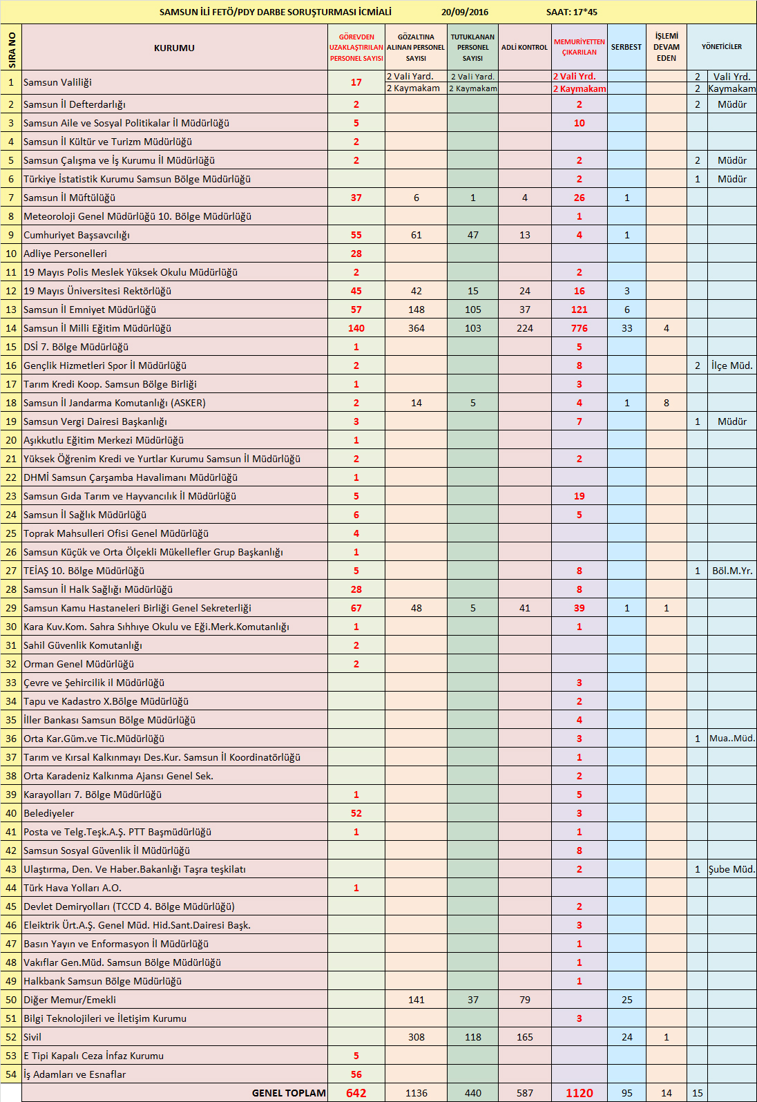 Samsun’da 15 Temmuz 2016 tarihinde meydana gelen darbe girişimine yönelik FETÖ/PDY terör örgütü soruşturması kapsamında, 20.09.2016 Salı günü saat 17.00 itibariyle ilimizde kamu personeli durumunu gösterir liste.