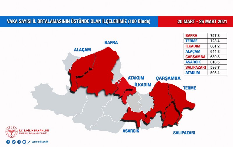 Samsun İl Sağlık Müdürlüğü 20-26 Mart haftasının ilçe vaka oranlarını açıkladı. Samsun il genelinde yüzbinlik dilime göre vaka oranı 508,97’den 586,84’e yükselirken, 8 ilçe il oranlarını geride bıraktı. Yüzbinlik dilimlere göre 8 ilçede oranlar şöyle sıralandı: Bafra 757,8; Terme 728,4; İlkadım 661,2; Alaçam 644,8; Çarşamba 630,8; Asarcık 616,5; Salıpazarı 598,7; Atakum 598,4.