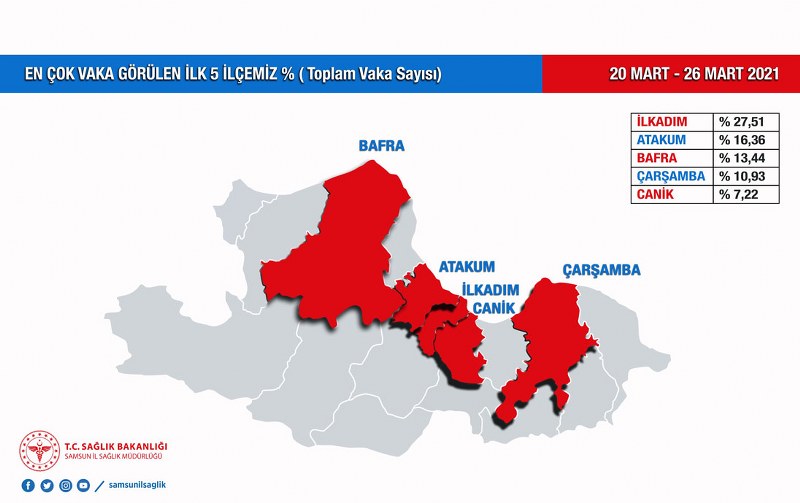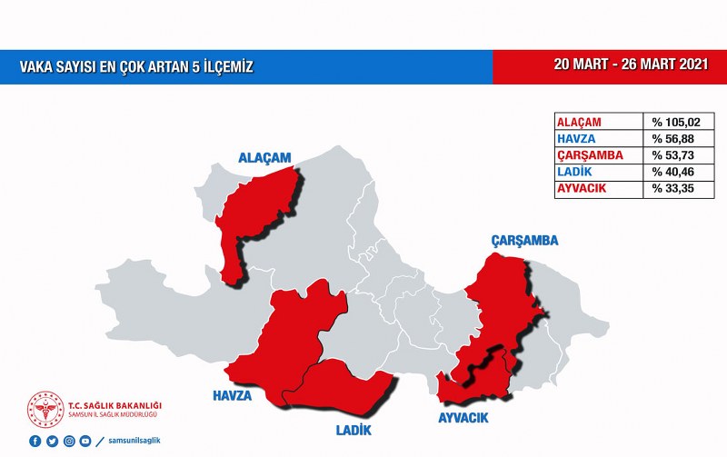 Geçen haftaya göre vaka sayıları artan ilçelerin başında Alaçam geldi. Alaçam’da bir önceki haftaya göre vaka sayıları yüzde 105,02 oranında arttı. Bu artış Havza’da yüzde 56,88; Çarşamba’da yüzde 53,73; Ladik’te yüzde 40,46; Ayvacık’ta yüzde 33,35 oranında gerçekleşti.