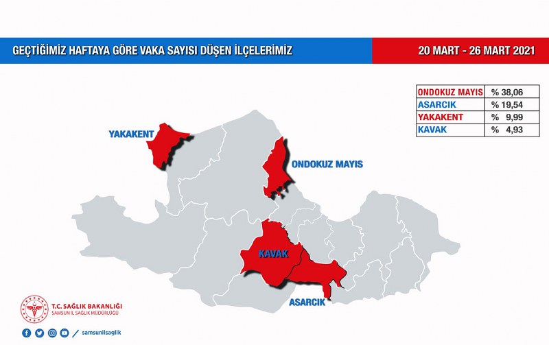 Samsun’da 20-26 Mart haftasında geçen haftaya göre vaka düşüşü olan illerin başında rekortmen Ondokuz Mayıs ilçesi geldi. Ondokuz Mayıs’ta vaka oranları yüzde 38,06; Asarcık’ta yüzde 19;54, Yakakent’te Yüzde 9,99; Kavak’ta yüzde 4,93 oranında düştü.