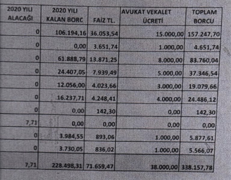 Ekteki listede de görüleceği üzere 106 Bin TL borcu olan çiftçiye 36 Bin TL faiz ve 15 Bin TL avukat ücreti gibi akıllara zarar bir icra takibi yaptılar.