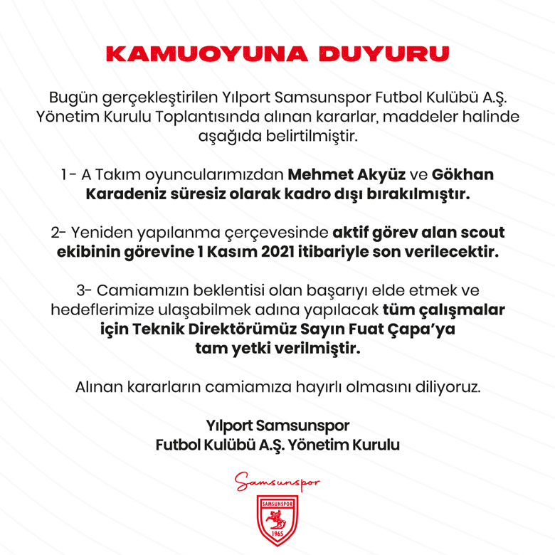 Kırmızı Beyazlı kulüpten yapılan açıklamada, “Bugün gerçekleştirilen Yılport Samsunspor A.Ş. Yönetim Kurulu Toplantısında alınan kararlar, maddeler halinde şöyledir; 1- A Takım oyuncularımızdan Mehmet Akyüz ve Gökhan Karadeniz süresiz olarak kadro dışı bırakılmıştır. 2- Yeniden yapılanma çerçevesinde aktif görev alan scout ekibinin görevine 1 Kasım 2021 itibariyle son verilecektir. 3- Camiamızın beklentisi olan başarıyı elde etmek ve hedeflerimize ulaşabilmek adına yapılacak tüm çalışmalar için Teknik Direktörümüz Sayın Fuat Çapa’ya tam yetki verilmiştir.