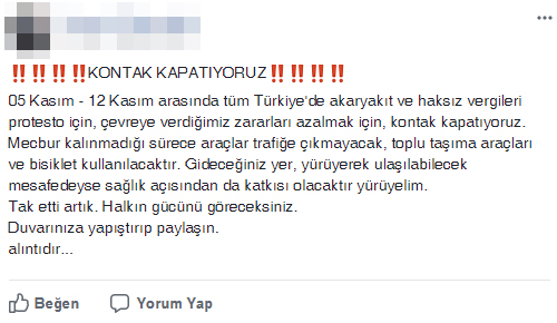Eylem çağrısında, “05 Kasım – 12 Kasım arasında tüm Türkiye’de akaryakıt ve haksız vergileri protesto için, çevreye verdiğimiz zararları azalmak için, kontak kapatıyoruz. Mecbur kalınmadığı sürece araçlar trafiğe çıkmayacak, toplu taşıma araçları ve bisiklet kullanılacaktır. Gideceğiniz yer, yürüyerek ulaşılabilecek mesafedeyse sağlık açısından da katkısı olacaktır yürüyelim. Tak etti artık. Halkın gücünü göreceksiniz. Duvarınıza yapıştırıp paylaşın” diye belirtiyorlar.